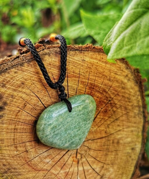 Natūralaus Amazonito pakabukas širdelės formos kartu su reguliuojamo ilgio, specialiai jam paruošta virvute.