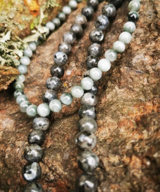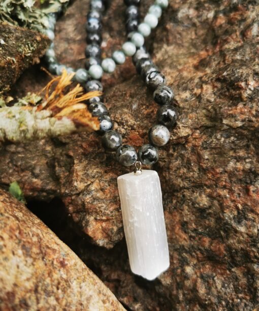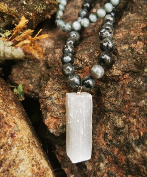 Retas akmenų derinys -Selenito pakabukas, Lavrikitas, Sakalo Akis (visi akmenys aukštos kokybės bei natūralūs), leidžia suprasti šio vėrinio ypatingą paskirtį.